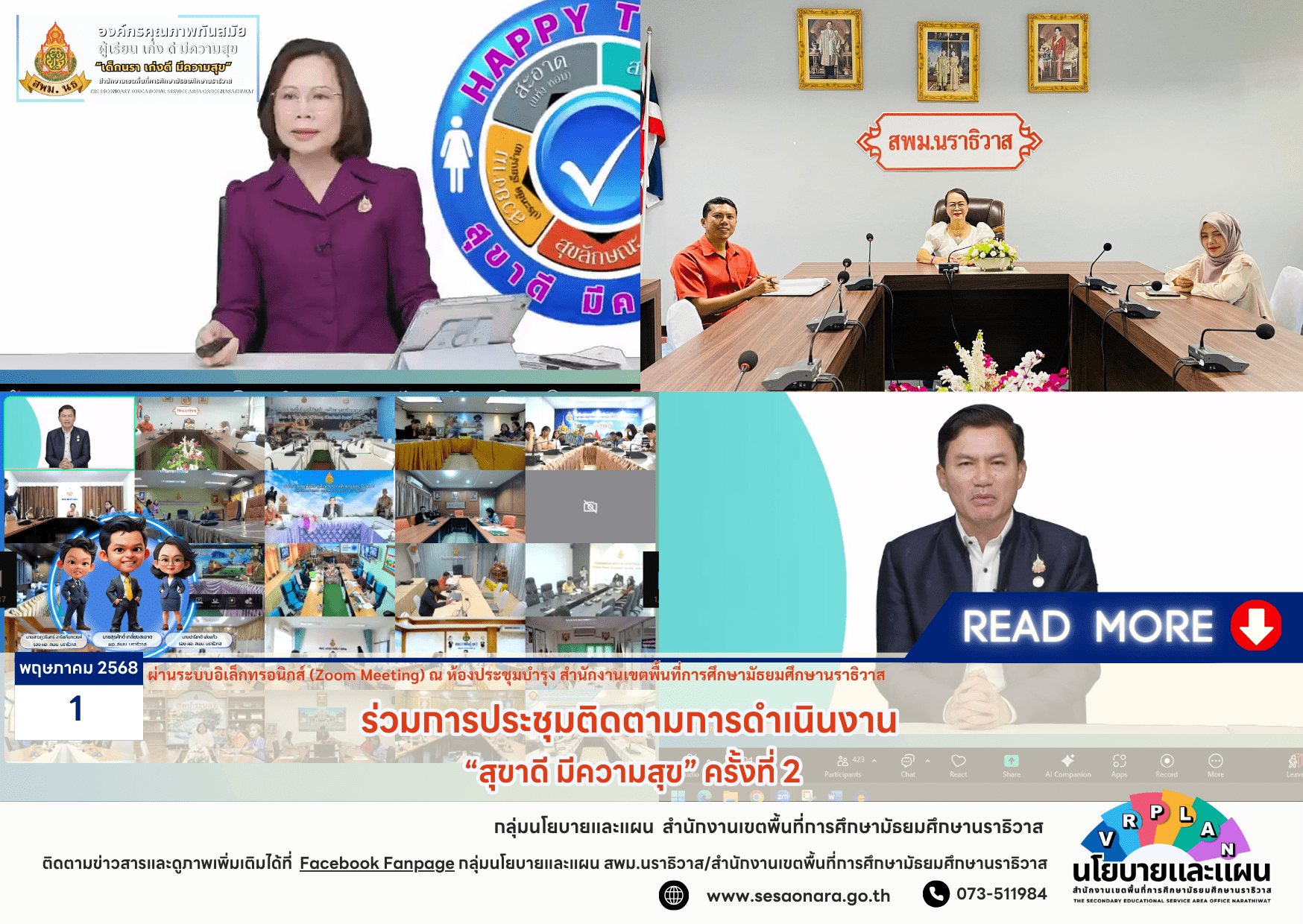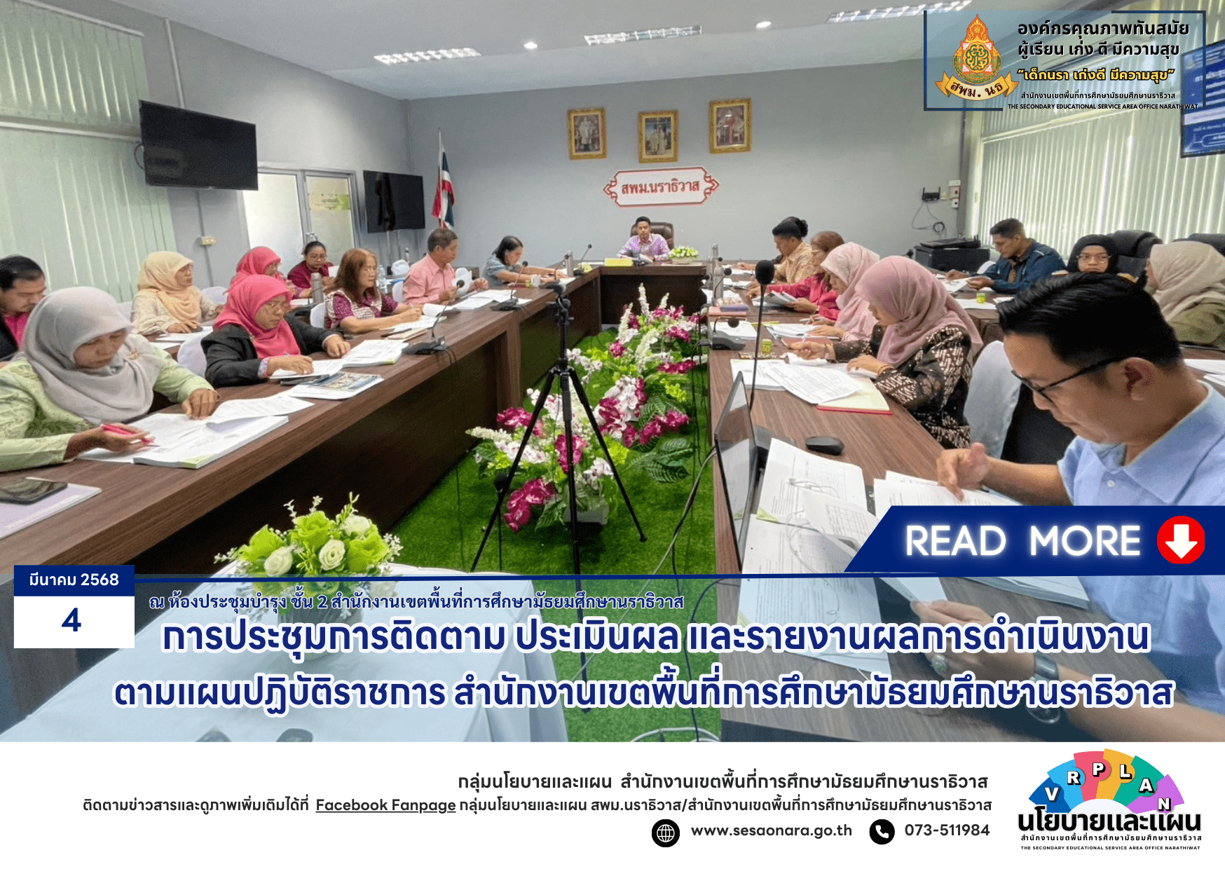 View detailsการประชุมการติดตาม ประเมินผล และรายงานผลการดำเนินงานตามแผนปฏิบัติราชการ สำนักงานเขตพื้นที่การศึกษามัธยมศึกษานราธิวาส