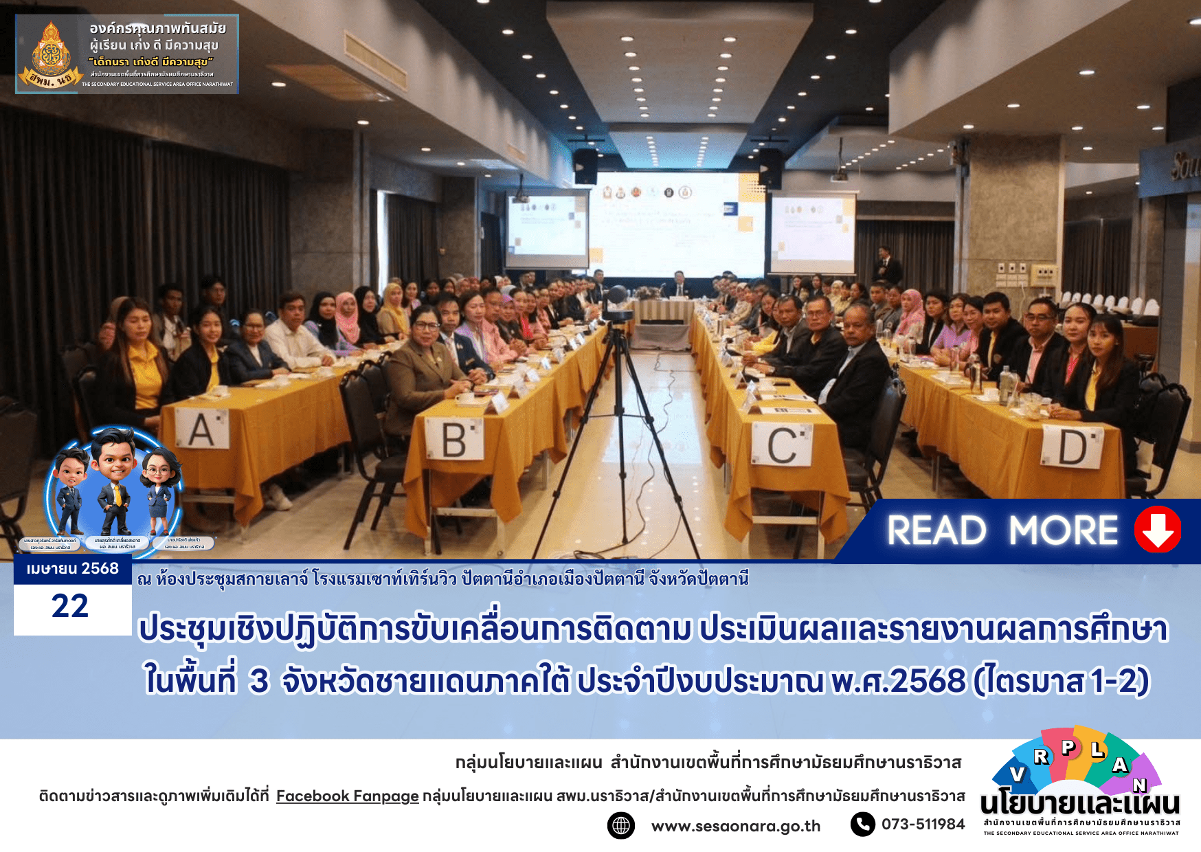 View detailsประชุมเชิงปฏิบัติการขับเคลื่อนการติดตาม ประเมินผลและรายงานผลการศึกษาในพื้นที่ 3 จังหวัดชายแดนภาคใต้ ประจำปีงบประมาณ พ.ศ.2568 (ไตรมาส 1-2)