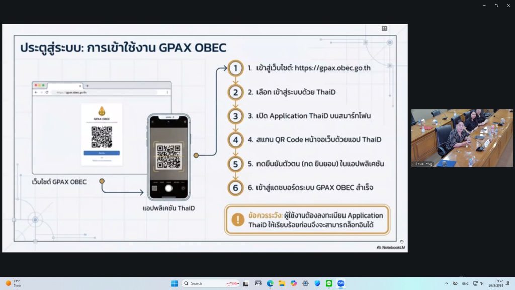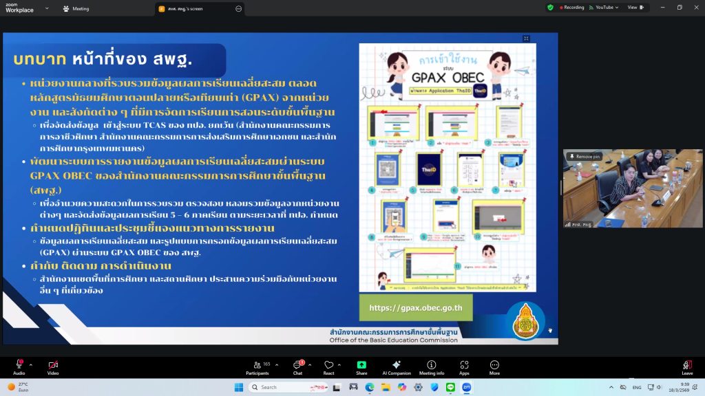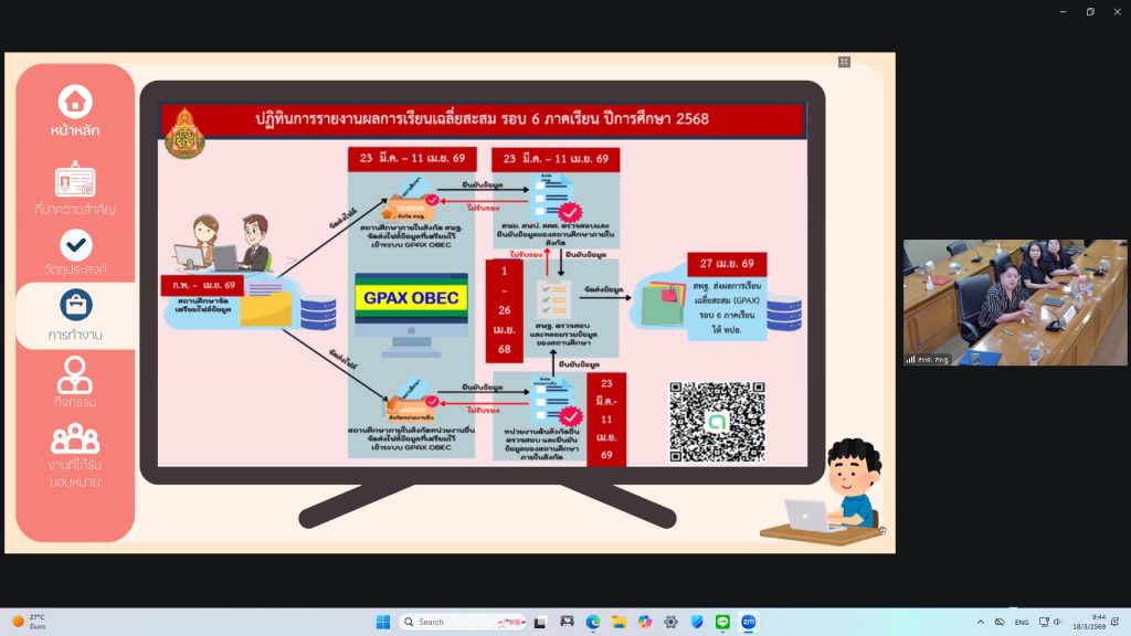 🗓 ในวันที่ 18 มีนาคม 2569 นายสุรศักดิ์ เกลี้ยงสะอาด ผอ.สพม.นราธิวาส มอบหมายให้ นางสาวเบญจพร สินแสงวัฒน์ ศึกษานิเทศก์ชำนาญการ เข้าร่วมประชุมโครงการอบรมเชิงปฏิบัติการการรายงานผลการเรียนเฉลี่ยสะสม (GPAX) เพื่อใช้ในการคัดเลือกกลางบุคคลเข้าศึกษาในสถาบันอุดมศึกษารอบ 6 ภาคเรียน ประจำปีการศึกษา 2569 (TCAS69) และ รอบ 4 ภาคเรียน ประจำปีการศึกษา 2570 (TCAS70) ผ่านระบบ GPAX OBEC ในรูปแบบการอบรมออนไลน์ ด้วยโปรแกรม Zoom ณ กลุ่มนิเทศ ฯ สำนักงานเขตพื้นที่การศึกษามัธยมศึกษานราธิวาส